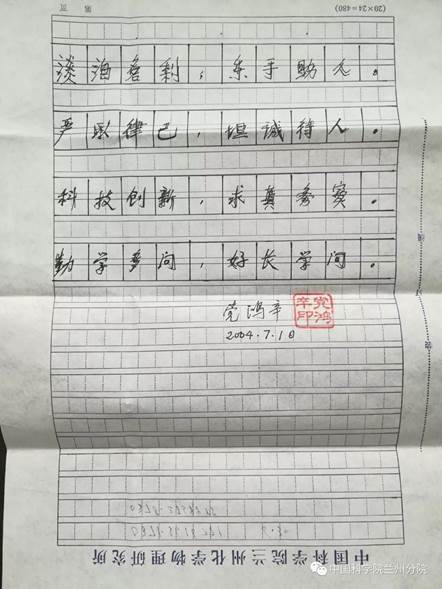 2004年7月10日,黨鴻辛躺在醫(yī)院病床上,在標識有“中國科學院蘭州化學物理研究所”字樣的一張稿紙上寫下遺訓: