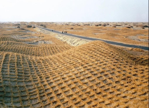 實(shí)際上,草方格最早應(yīng)用于我國(guó)第一條沙漠鐵路包蘭鐵路的建設(shè)中。在寧夏沙坡頭地區(qū)火車(chē)穿越了騰格里沙漠,在科技工作者和當(dāng)?shù)厝罕姷墓餐ο?,麥草方格編成的巨網(wǎng)最終成功縛住了“沙龍”。沙坡頭因此被稱(chēng)為“草方格的故鄉(xiāng)”。如今,一把鐵鍬,一捆麥草,一片草方格,沙坡頭實(shí)現(xiàn)了黃沙變綠洲的嬗變,騰格里沙漠中神奇地出現(xiàn)了一條連綿延伸的“綠帶”。